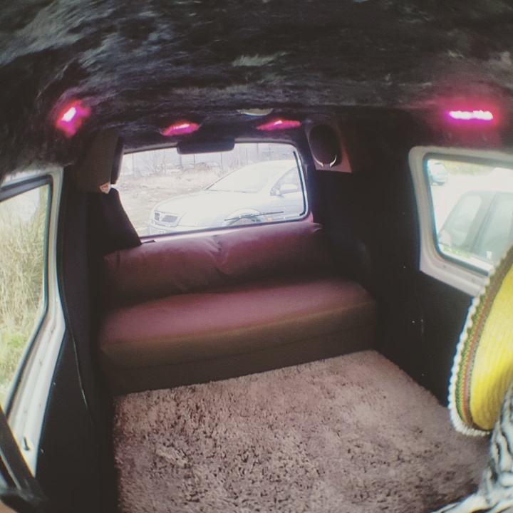 I cut four rectangular holes in the fur roof lining and cut some frosted perspex to fit. I then fixed in 8 rows of three rgb LED lights to the roof of the van and two just above each sliding door.