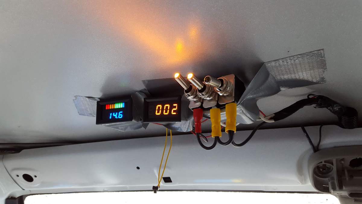 The wiring for the lights and stereo all runs to a central fuse box which is powered by the leisure battery. The leisure battery is wired to the main car battery via a box which cuts off the connection while the engine is not running. This lets it charge while driving but doesn’t drain the main car battery while we’re using power.