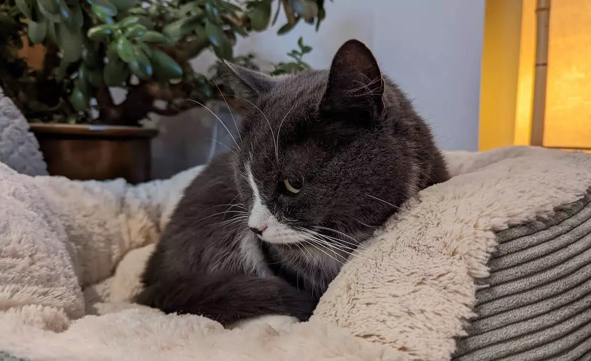 When our first child came along in summer 2021, the cats took a backseat for a while. Kamino didn’t seem to mind though. By the time our second arrived, he and Eevee were returning to their old routines, spending more time with us again and even happily interacting with the kids. Kamino took his usual spot on the corner of the couch, just like he did in when he was a kitten. At night, he’d patiently sit by the cupboard where the cat food was, waiting for his food before bed. In the winter he would sleep in the cat bed with Eevee which was really nice to see.